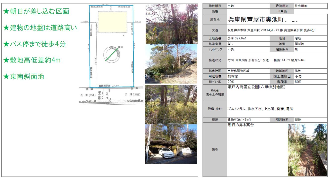 | 183 | 古家付売地 150坪 奥池南町 3680万円 西に広がる六甲山の山並 |